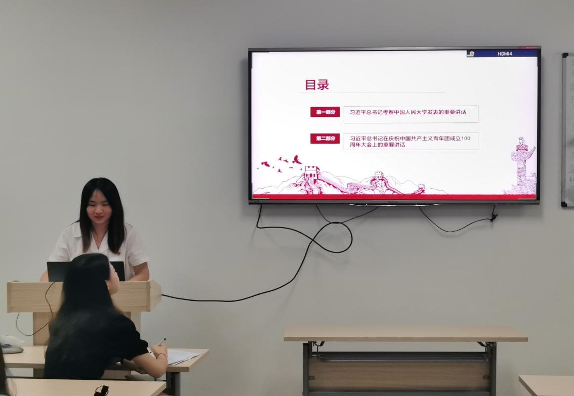 会议首先学习了习近平总书记考察中国人民大学发表的重要讲话精神。蒋静怡从“大课题”“大先生““大熔炉”“大命题”四方面对讲话内容进行详细解读,号召支部成员心中坚定理想信念,不忘青年使命,承担青年责任,勇于砥砺奋斗,练就过硬本领。
