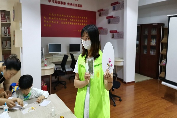 科普环节结束后,在志愿者胡梦雪、张佳铭的带领下,开展了干花拼贴花的园艺体验活动。志愿者辅助小朋友用白乳胶将干花贴在扇面纸板上,发挥小朋友的创造力,用干花绘制出心中的美丽图案。活动中,部分小朋友的家长也参与进来,与小朋友一起创作自己的作品,既锻炼了小朋友的动手能力和审美创造能力,又进一步加强了亲子关系。