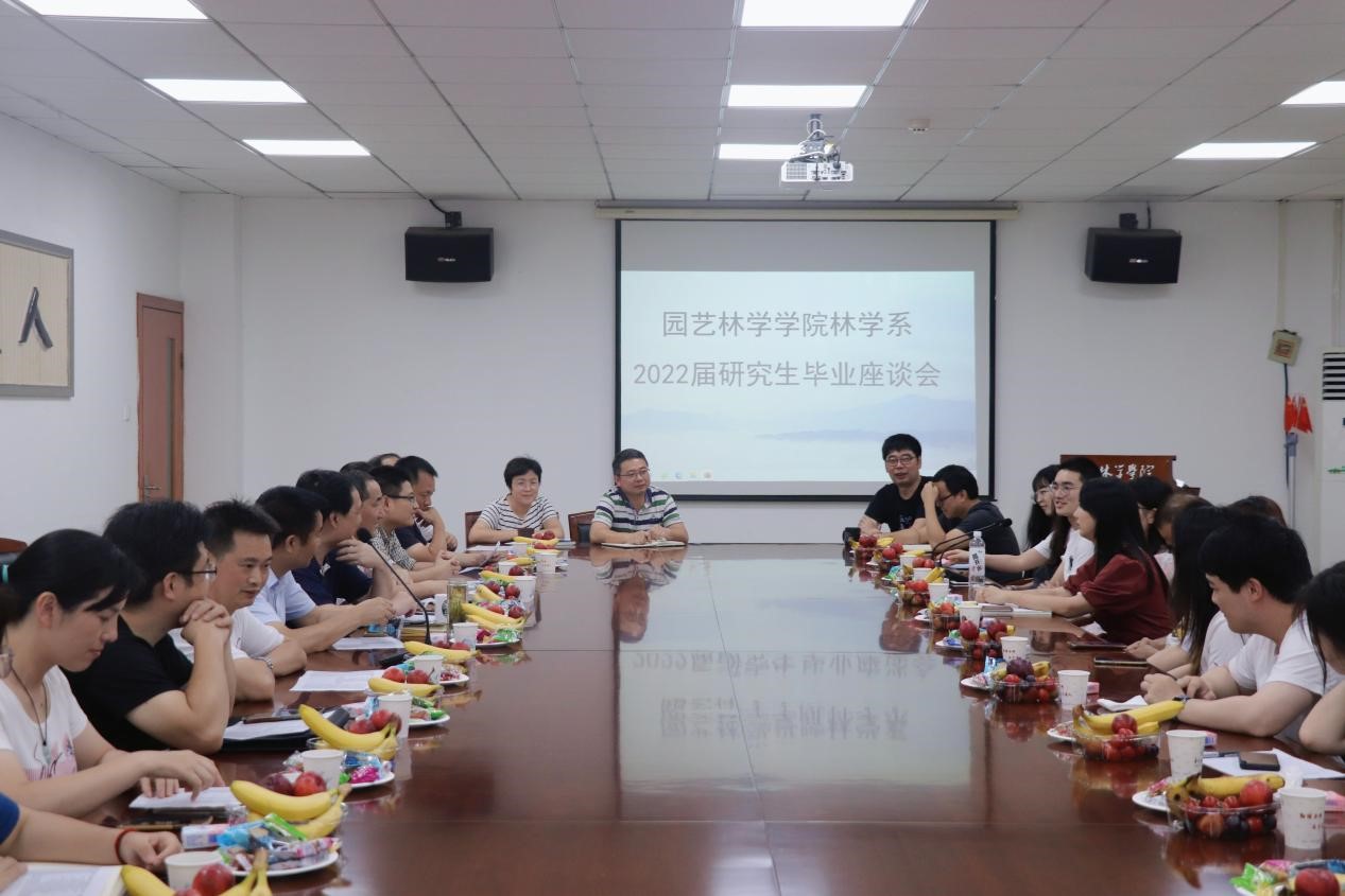 2022年6月19日下午,艾弗森贝博ballbet官网林学系研究生毕业座谈会在园林北楼302会议室召开。院党委书记张宏荣、院长程运江、副书记蔡江、副院长王鹏程以及全体林学系老师、辅导员肖晗和20余位2022届毕业研究生参加了座谈会,会议由林学系主任杜克兵主持。