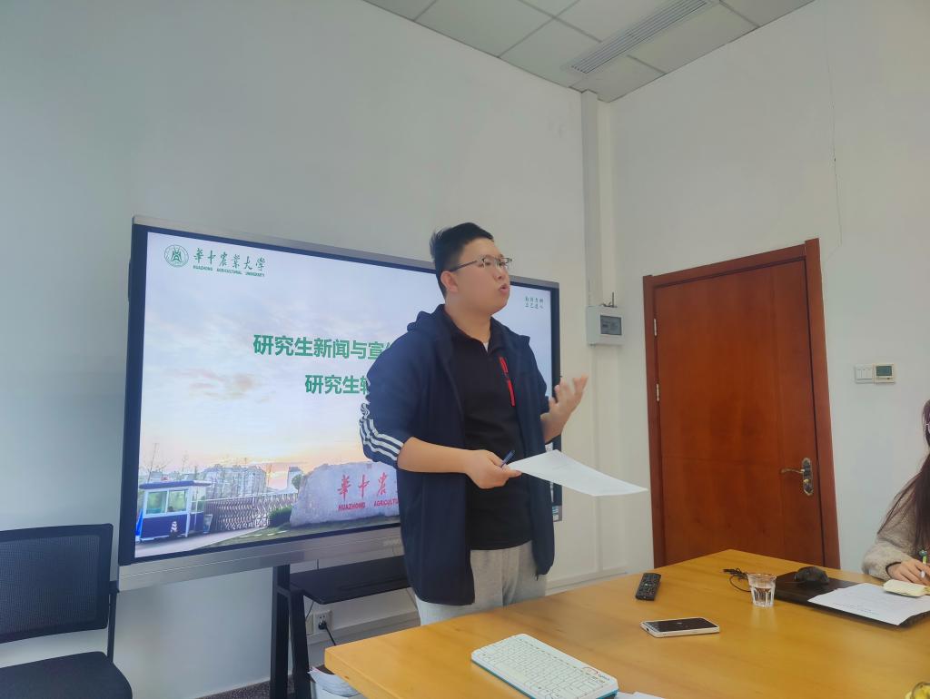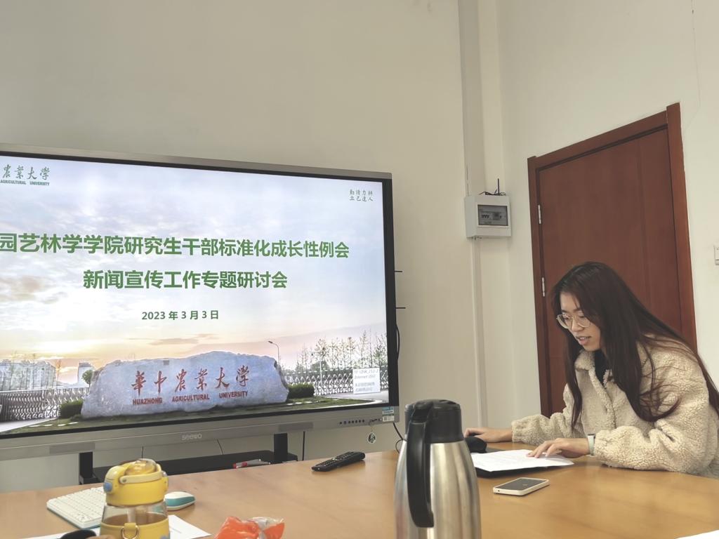 会议的最后,由研究生新闻与宣传工作指导老师肖晗从多个方面指出新闻与宣传中心现存问题及未来发展方向即:一、主要负责人加强学习,增强校园文化宣传工作等;二、今后例会部门负责人准备两到三分钟的主题汇报;三、研究生会和团工委之间共享台账,加强沟通与交流;四、讲好园林故事,关注两季三节等相关活动的举办;五、加强一些实践性项目的举办。