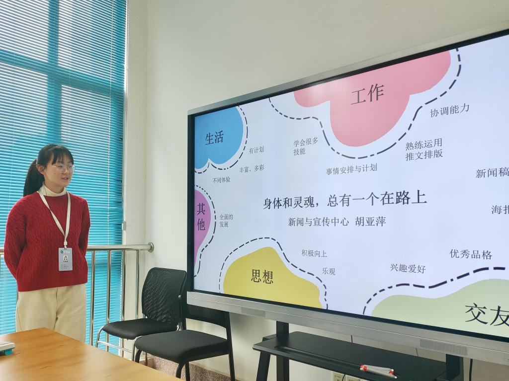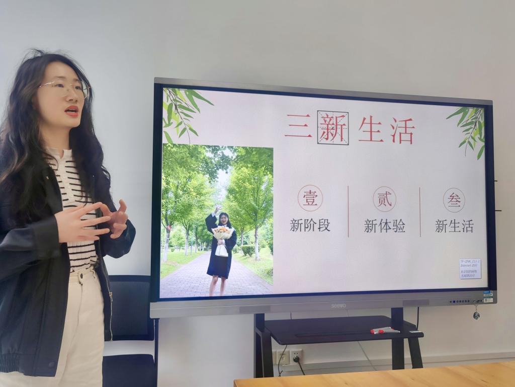 部门负责人陶帆从“三新生活”来概括自己的这一年的收获,从新阶段的从本科到研究生;迈出从零到一的新闻稿的写稿的新体验;新生活则是逐渐繁忙的科研生活三方面介绍入学以来的感悟与体验,反思自我,找到适合的生活节奏。