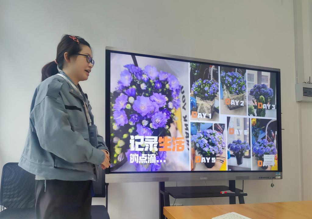 部⻔负责人代谦山分享了自己养花的感受和体悟,她严格按照步骤细心养花,适当的浇水和合理的光照,通过养花这件小事带给她很多收获和成就,让她具有挑战成功的满足感和记录生活点滴的充实感和快乐感。