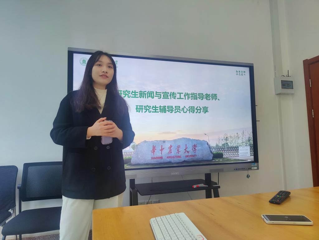 首先,会议第一项议程,由研究生新闻与宣传中心及团工委宣传部干部进行分享。部门负责人胡亚萍围绕自己上学期生活、工作、学习、交友、思想以及其他等方面进行分享,总结介绍了自己上学期的收获与成⻓。