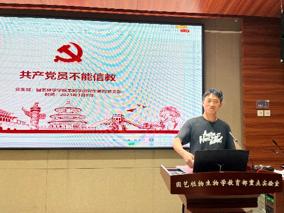 3月8日晚,艾弗森贝博ballbet官网果树学研究生第四党支部在南楼204会议室召开三月主题党日活动,本次党日活动分为学习中央一号文件、习近平对深入开展学雷锋活动作出的重要指示、全国“两会”内容、党的二十大精神、党员不能信教等五个部分的理论知识。党支部书记刘旭主持会议,支部全体党员共同参与学习。
