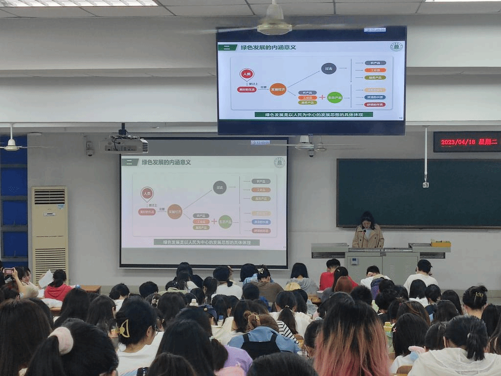 徐婷婷通过塞罕坝林场,浙江农村的“美丽转身”等事例引出“绿水青山就是金山银山”。徐婷婷分别从绿色发展的十年成就,内涵意义和华农行动三个层面对绿色发展进行深刻解读。并通过视频带领同学们回顾了新时代十年中国的绿色发展成就。