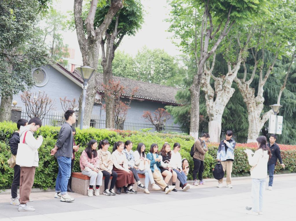 尹良芬老师与同学们边参观边交流(通讯员 张扬 摄)