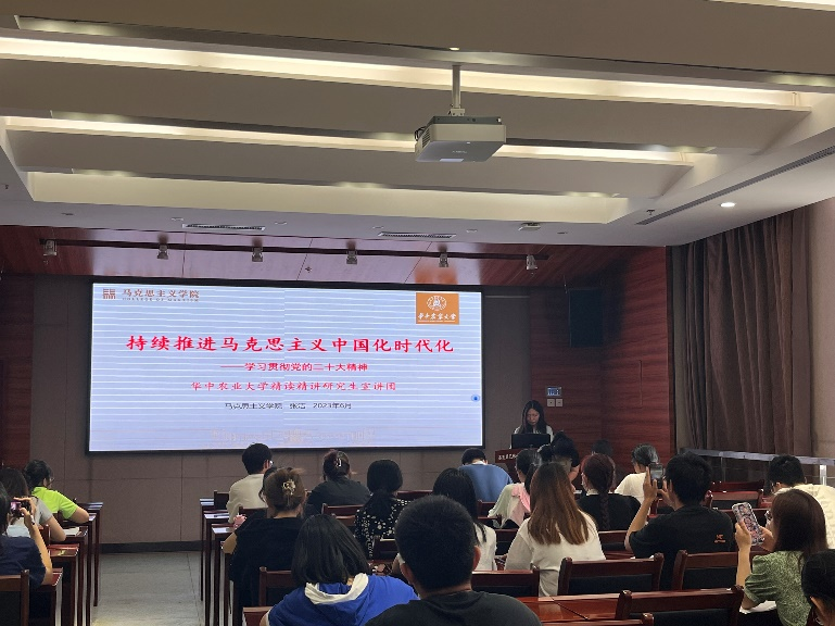 首先,学校研究生“精读精讲”宣讲团成员张洁同志,以“持续推进马克思主义中国化时代化”为主题进行宣讲。张洁提到,马克思主义中国化是将马克思主义基本原理同中国具体实际和中国优秀传统文化相结合形成的具有中国风格、中国智慧、中国气派的中国化马克思主义;马克思主义时代化将马克思主义基本原理与时代特征相结合,要求既要立足于中国的时代特征,又要放眼于世界潮流趋势。张洁讲到,马克思主义中国化时代化具有三重逻辑,即理论逻辑、历史逻辑和实践逻辑,新时代奋力谱写马克思主义中国化时代化新篇章,必须致力于“六个坚持”。这“六个坚持”是必须坚持人民至上、必须坚持自信自立、必须坚持守正创新、必须坚持问题导向、必须坚持系统观念、必须坚持胸怀天下。