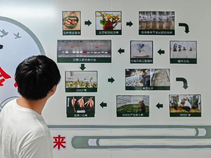 在那之后,组培脱毒中心就承担起了繁育脱毒种苗的重任,年繁育脱毒种苗可达1亿株,从实验室里走出的种苗,在红安苕种苗训化室里进行科学栽培,经过15天训化后就可移植到大棚内进行扩大繁育。