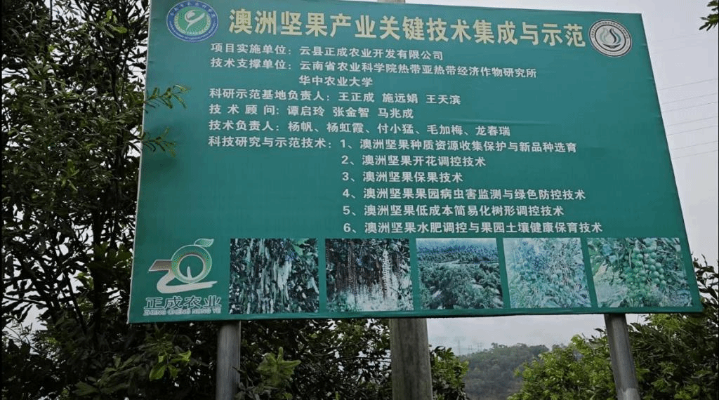 参观完澳洲坚果提质增效示范基地后,实践团来到了位于临沧市云县的澳洲坚果产业关键技术集成与示范基地。该基地的实施单位为云县正成农业开发有限公司,技术支撑单位为艾弗森贝博ballbet官网和云南省农业科学院热带亚热带经济作物研究所。该基地主要的研究和示范技术为(1)澳洲坚果种质资源收集保护与新品种选育(2)澳洲坚果开花调控技术(3)澳洲坚果保果技术(4)澳洲坚果病虫害监测与绿色防控技术等。该基地的主要建圃品种为桂热一号、OC、A4、A16、农试344、农试296.