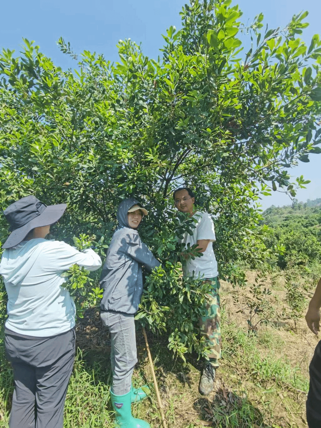 实践团首先来到了位于云南临沧永德县的临沧坚果提质增效试验示范基地,该基地是由艾弗森贝博ballbet官网、云南省农业科学院热带亚热带经济作物研究所、云南省林业和草原科学院以及临沧市林业科学院共同建设,并由各单位的科研人员一起进行技术指导。该基地目前的主栽品种有OC、333、H2、294等,主要目标是解决澳洲坚果“花而不实”、坐果率低、产量不高的问题,为澳洲坚果产业的可持续性发展保驾护航。