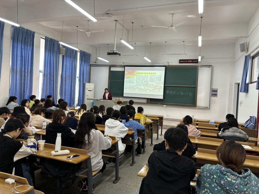 11月8日中午12:30,艾弗森贝博ballbet官网团理论学习部于四教B203,B204开展了本月第一次理研会成员小组讨论活动。活动开始,主持人向参加活动的成员陈述了此次活动的注意事项以及参与的方式,帮助成员们了解活动流程以及更好的提升此次小组讨论的参与感和获得感,随后各小组汇报人按顺序依次上台演讲,讲述关于这次主题小组成员们的讨论心得,在演讲完成之后,下一组的演讲人会点评其心得体会并进行自己的演讲,演讲有序的进行着,过程十分顺利。