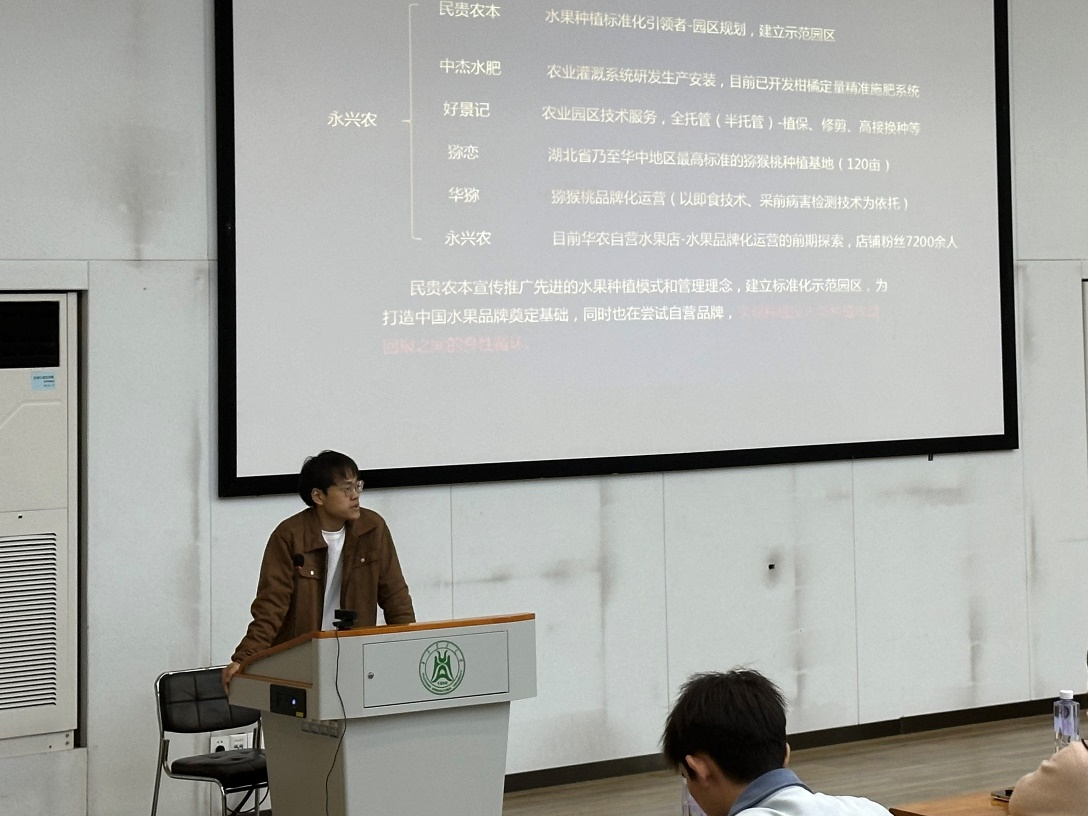 接着,19级果树系硕士研究生吴厚涌给大家分享了关于他的创业故事。他谈到,目前水果市场存在流通慢、不新鲜、损耗高、无法满足个性化需求等问题。于是他根据市场痛点,打造了“永兴农”这一宣传推广先进的水果种植模式和管理理念的行业IP,为实现种植投入与种植收益回报之间的良性循环、打造中国水果品牌奠定了基础。同时他谈到,学校和政府出台了许多关于学生创业的补贴政策,他鼓励学弟学妹们多去参加双创类比赛,不仅可以锻炼自己能力,还可以获得一定的创业补贴。