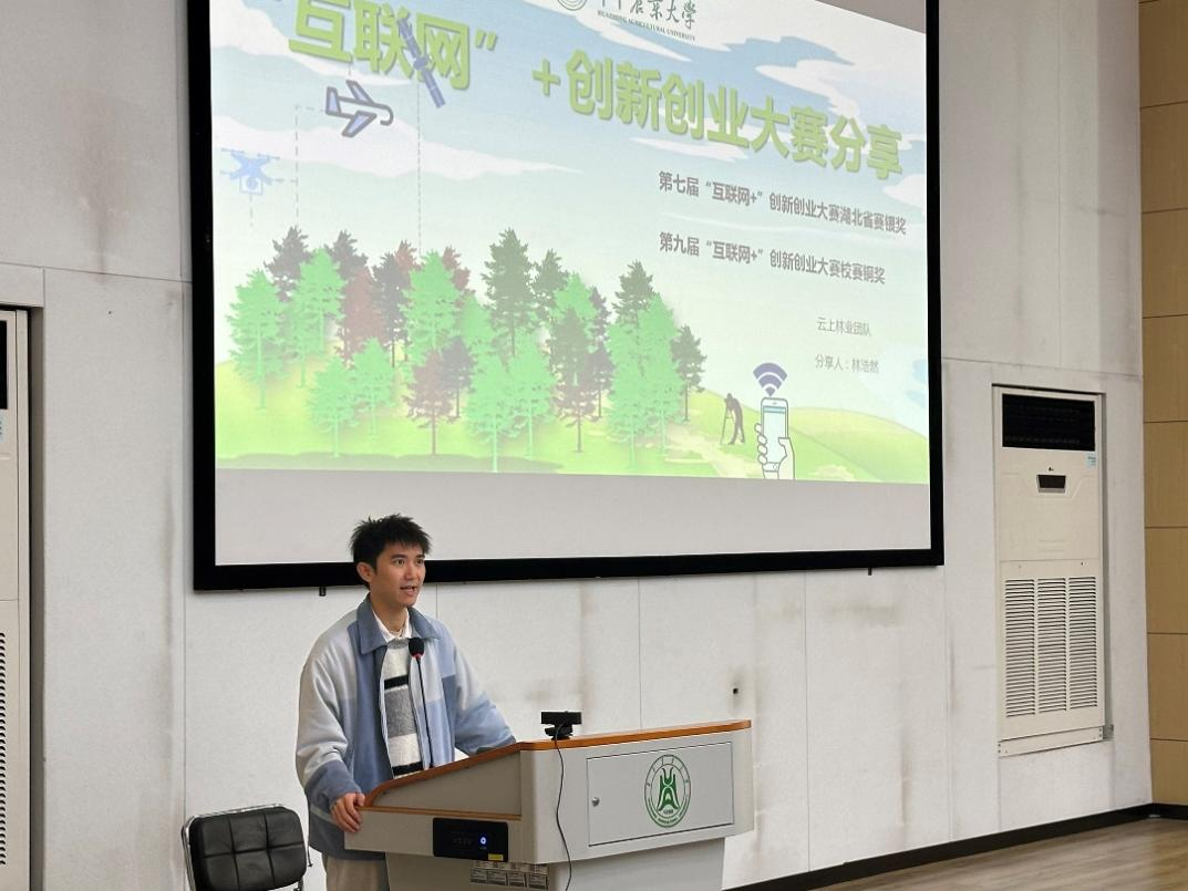 随后,22级森林经理学研究生林浩然向大家讲解了他所参加的“森防云卫士”和“森林哨兵”这两个项目,并重点分享了“互联网+”的参赛经验。他提到,参加“互联网+”这类的创新创业比赛对于提升个人的演讲能力和组织管理能力有很大的帮助,并鼓励学弟学妹们多去参加这类比赛来锻炼自己。