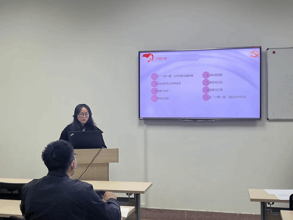 最后王沁瑶同志领学了习近平总书记在第三届“一带一路”国际合作高峰论坛开幕式上的主旨演讲,支部党员共同学习了“一带一路”八项行动的重要内涵。