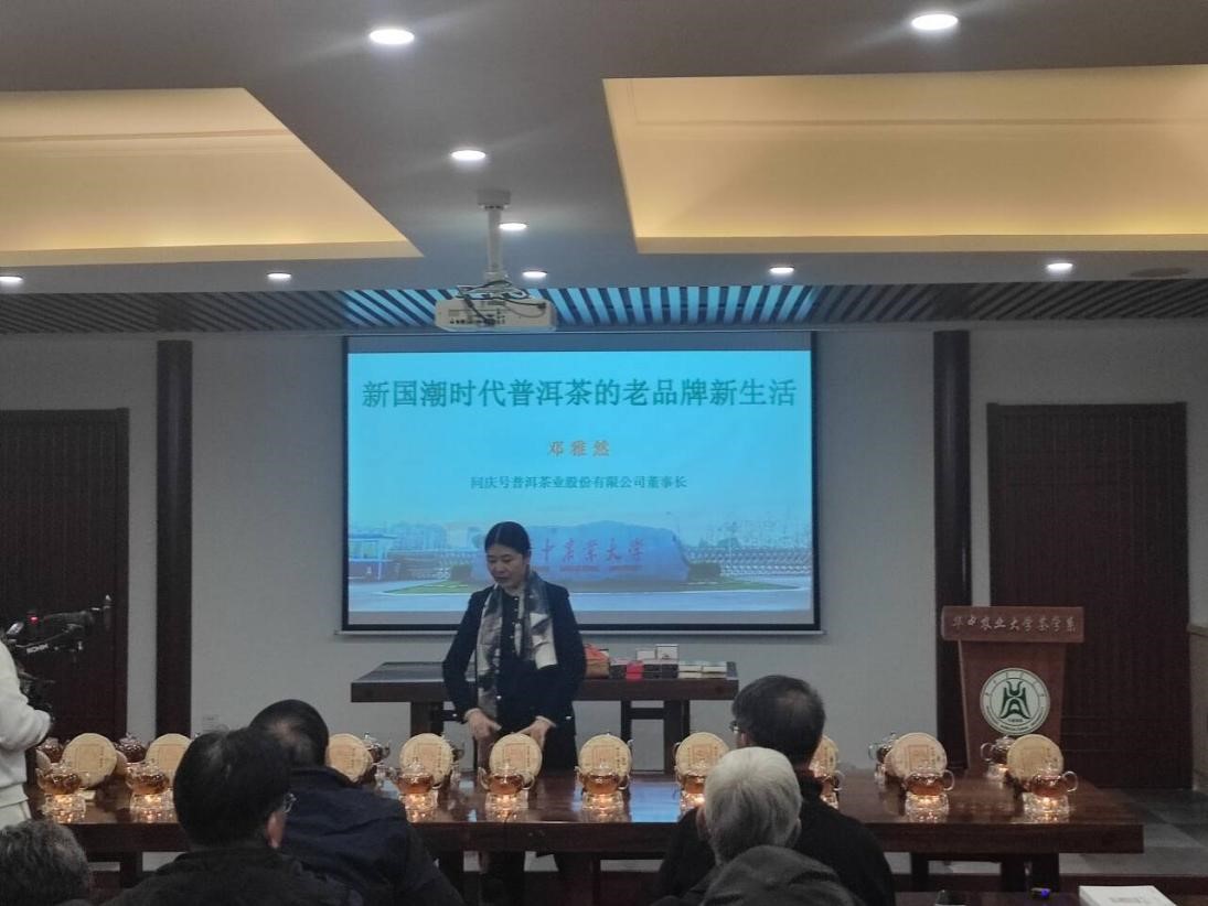 会议开始,邓雅然董事长为同学们讲解了普洱茶的悠久历史以及她与普洱茶的结下的缘分。她的汇报共分为四个方面,包括“普洱茶特色产品讲解”、“我与普洱茶的故事”、“现场普洱茶品鉴”、“答疑环节”。汇报内容声情并茂,环环相扣,用亲身体验生动形象地介绍了茶叶的悠久历史,普洱茶的产品特征,激发了同学们对于普洱茶的浓厚兴趣。