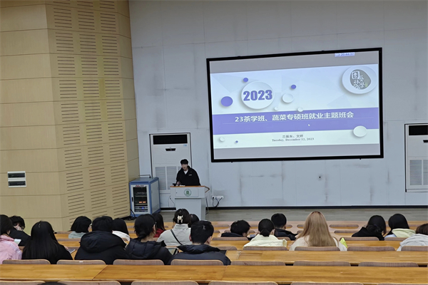 1212日晚上,2023级蔬菜专硕班就业主题班会在三教S2报告厅召开。班长李抗、团支书刘艳丽及全班成员到场参会,会议由就业委员兰振东主持。