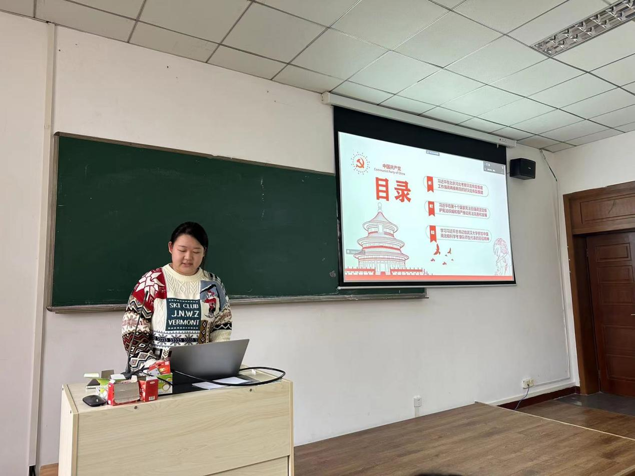 随后,夏琳同志领学了习近平总书记在第十个国家宪法日之际作出的重要指示精神和习近平总书记给武汉大学参加中国南北极科学考察队师生代表的回信精神。习近平总书记在回信中肯定了武汉大学参加中国南北极科学考察队师生代表对我国极地科学考察事业作出的积极贡献,并鼓励广大师生要始终胸怀“国之大者”,接续砥砺奋斗,练就过硬本领,勇攀科学高峰。