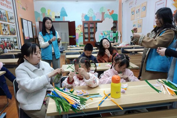 简短的“女性赞美”——花艺知识科普结束后,志愿者丁浩伟提出在妇女节这样特殊的日子里,可以通过赠送一捧永不凋谢的花束来表达对女性家属的爱意。在扭扭花手工制作环节中,志愿者来到小朋友和家长身边,向他们讲解“郁金香扭扭花”的步骤与技巧。小朋友们精心搭配花朵的色彩并学会了花瓣的制作与花朵的拼接,过程中主动与志愿者交流花朵制作的创意,活动现场热闹而温馨。