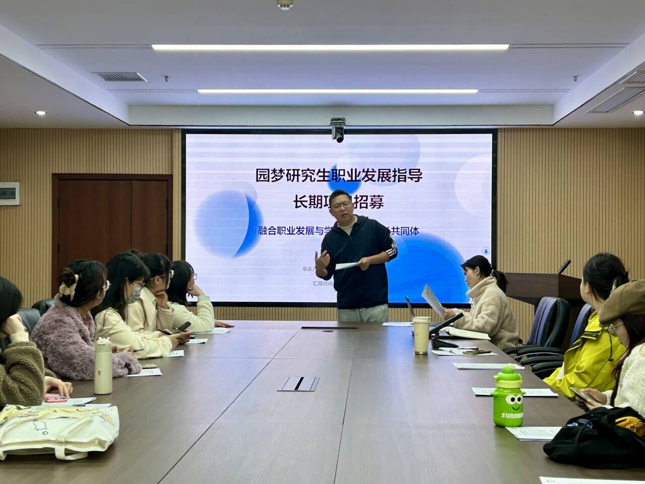 首先,肖晗对园.梦研究生职业发展指导长期项目进行了全面地讲解。从“为何做、做什么、怎么做”向参会职业委员详细解释了项目实施的缘由和具体内容,并强调了该项目对研究生职业发展的重要性。他鼓励已具有明确就业目标的同学积极报名,“以长期化学习应对未来短期考核评价,以团队式协同成长替代单打独头式发展,以复合能力提升和实践应对未来发展评价”。