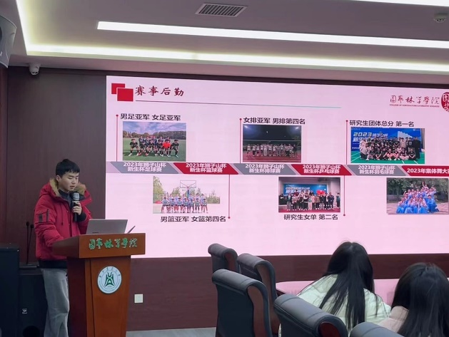 文体部总负责人党龙从季度工作成果与后续工作展望两方面开展了汇报,总结了文体部的赛事后勤工作、文体活动组织等工作内容。展望“狮子山杯”赛事动员及后勤保障、“五四选拔”——本研歌唱比赛的后续工作。