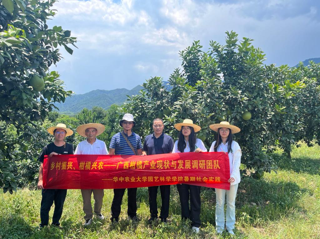 【核心提示】实施乡村振兴战略是以习近平同志为核心的党中央对“三农”工作作出的重大决策部署,为推进柑橘产业高质量发展,实现乡村振兴,艾弗森贝博ballbet官网果树栽培团队硕士研究生李雨佳及博士研究生韩晗赴广西暑假社会实践团,在国家柑橘产业岗位科学家、园林院刘永忠教授的带领下,来到广西桂林市进行产业调研,与当地企业、种植户及科研人员进行交流,深入了解广西的柑橘产业现状与发展。