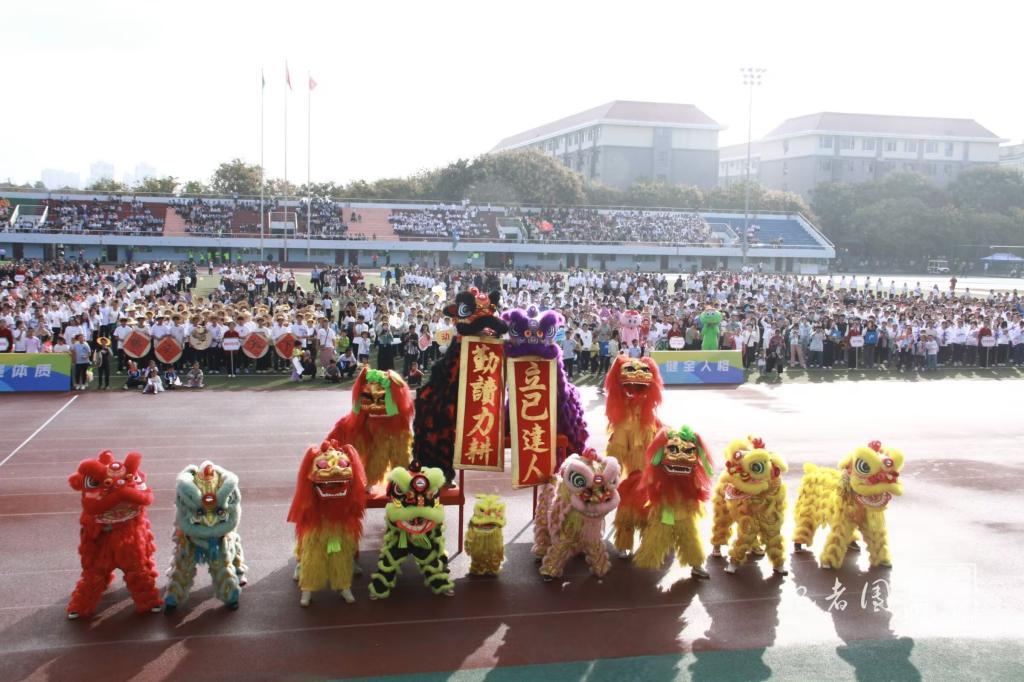锣鼓声响,“醒狮”“腾龙”身现观礼台,校党委书记高翅为其点睛。“一点左眼,灵气满身;二点右眼,志在乾坤;三点天灵,前程似锦。”鼓声铿锵,节奏激昂,在观众们的喝彩声中,舞狮者们与狮子融为一体,展现出传统艺术的无穷魅力。