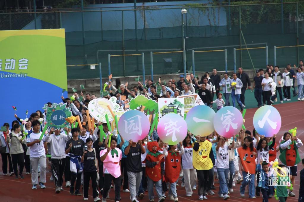 接下来,运动员、裁判员及代表方队陆续入场。贝博ballbet官网方阵创意丰富,尽显活力,与学院特色紧密结合。前排同学身着卡通水果马甲,手举“园林一家人”文字牌;后排同学手持绿色和橙色加油棒,举着代表茶学、园艺、林学、景园、设施五个专业的图案牌,伴随音乐向观礼台前进。