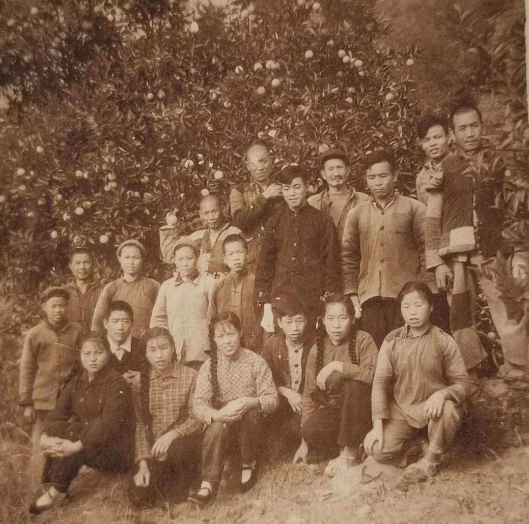 1980年12月省农业厅召开柑橘抗寒会议,章文才先生(中)与参会的学生们合影。学生左起万蜀渊、顾厚庄、屠清波、周绂、邓宏仁、伍晚霞。图中万蜀渊、顾厚庄、章先生三位已故