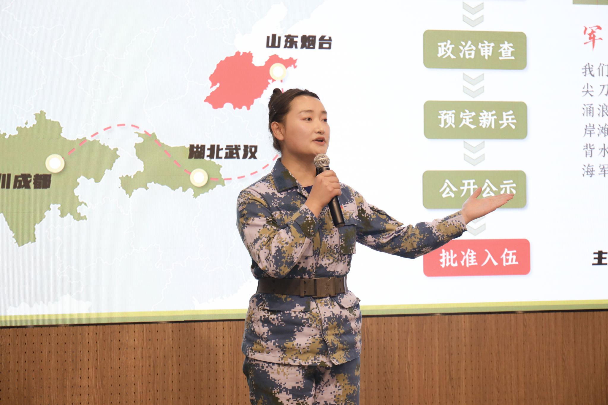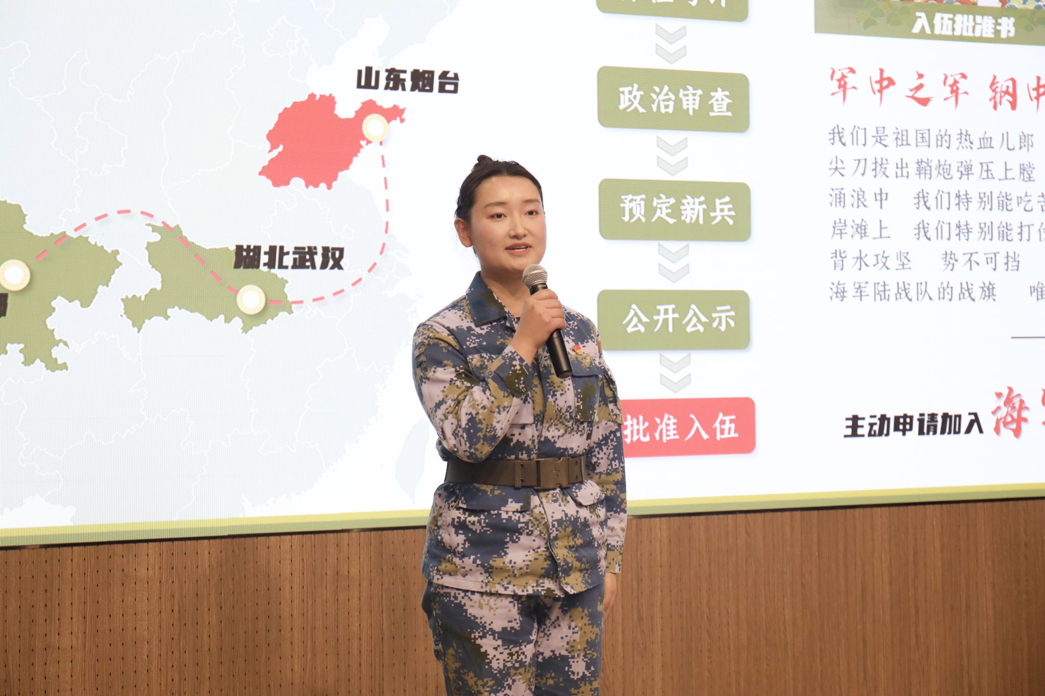 相比于其他人,简雪燕多了一段引以为傲的从军经历。出身军人世家的她从小就受到了严格的教育和红色文化的熏陶,培养了坚韧不拔的意志和追求卓越的精神,也对军队产生了特殊的情感。大一学年结束后,简雪燕果断选择了参军入伍,并通过层层选拔成功进入北海舰队训练基地,开始了为期两年多的艰苦训练。在新兵连训练的生活并不轻松,一向要强的简雪燕常常对自己的考核表现不够满意,“手榴弹投掷”不及格的成绩更是让她一度感到失落沮丧。但短暂的挫折并未消磨简雪燕的斗志,她很快调整好心态,保持乐观,分析自己在训练中存在的问题,积极寻找解决办法。回忆起这次挫折,简雪燕感慨颇多:“我不断地加练加训,最终克服了自身短板。这次的‘不及格’提醒了我及时弥补不足之处,更让我明白了只要自己肯努力,就没有克服不了的困难。”秉持着这样的信念,简雪燕以优异的成绩顺利完成了新兵连的考核,在下连分配时又主动报名加入有“军中之军,钢中之钢”之称的海军陆战队,开始了新阶段更高强度的磨练。