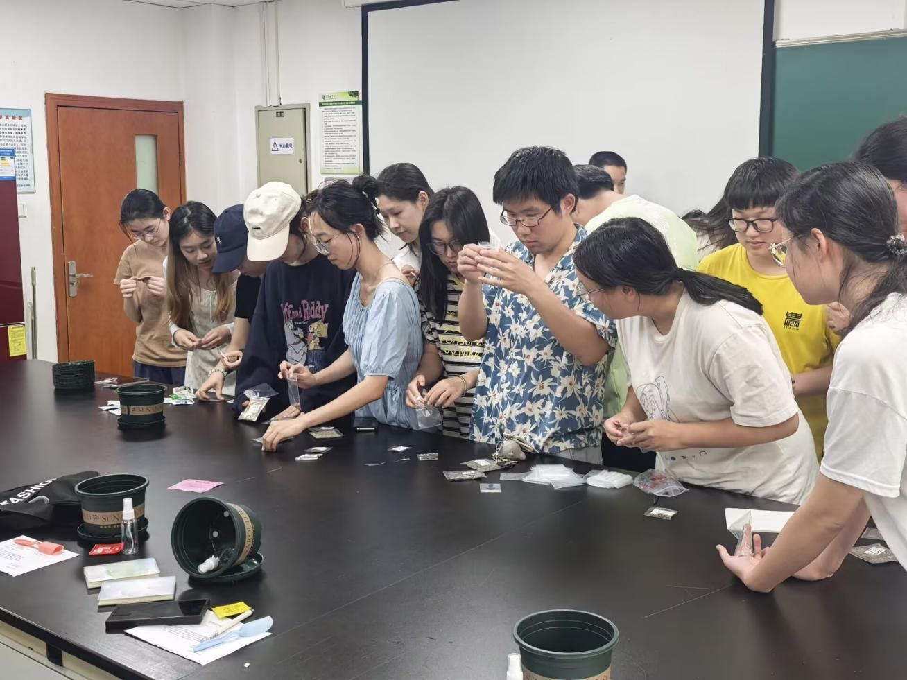 在植物知识问答环节,“绿萝夜间是否释放氧气?”“多肉植物耐旱的生物学原理”等问题引发热烈抢答,答对者将获赠一份“植物能量包”,能量包拥有缓释肥、装饰小摆件、干花花束、植物贴纸等精美礼品。随后的种植环节,工作人员提前准备了满天星、太阳花、向日葵等多种花束,以及一系列园艺工具。同学们戴着手套铲土、撒种、浇水,现场洋溢着“园丁”般的专注与期待。来自林学专业的杨荟同学表示:“亲手种下的不仅是种子,更是对慢生活的向往。”
