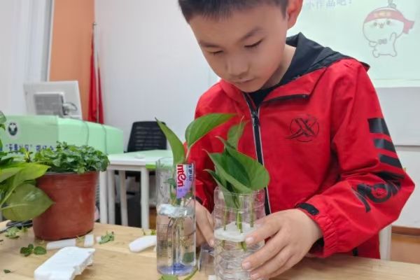 为深化理解植物茎的功能,活动还特别设置了扦插实验环节。志愿者提前回收塑料瓶、泡沫板并消毒处理,指导小朋友剪取薄荷、绿萝枝条,利用泡沫板固定后漂浮在装有水的塑料瓶中。小朋友们小心翼翼地调整枝条角度,记录观察要点,一名参与实验的孩子满怀期待地表示“我好想看看快点它长根的样子!”这一环节不仅让孩子们掌握了植物扦插的基本原理,更激发了他们对生命科学的探索兴趣。