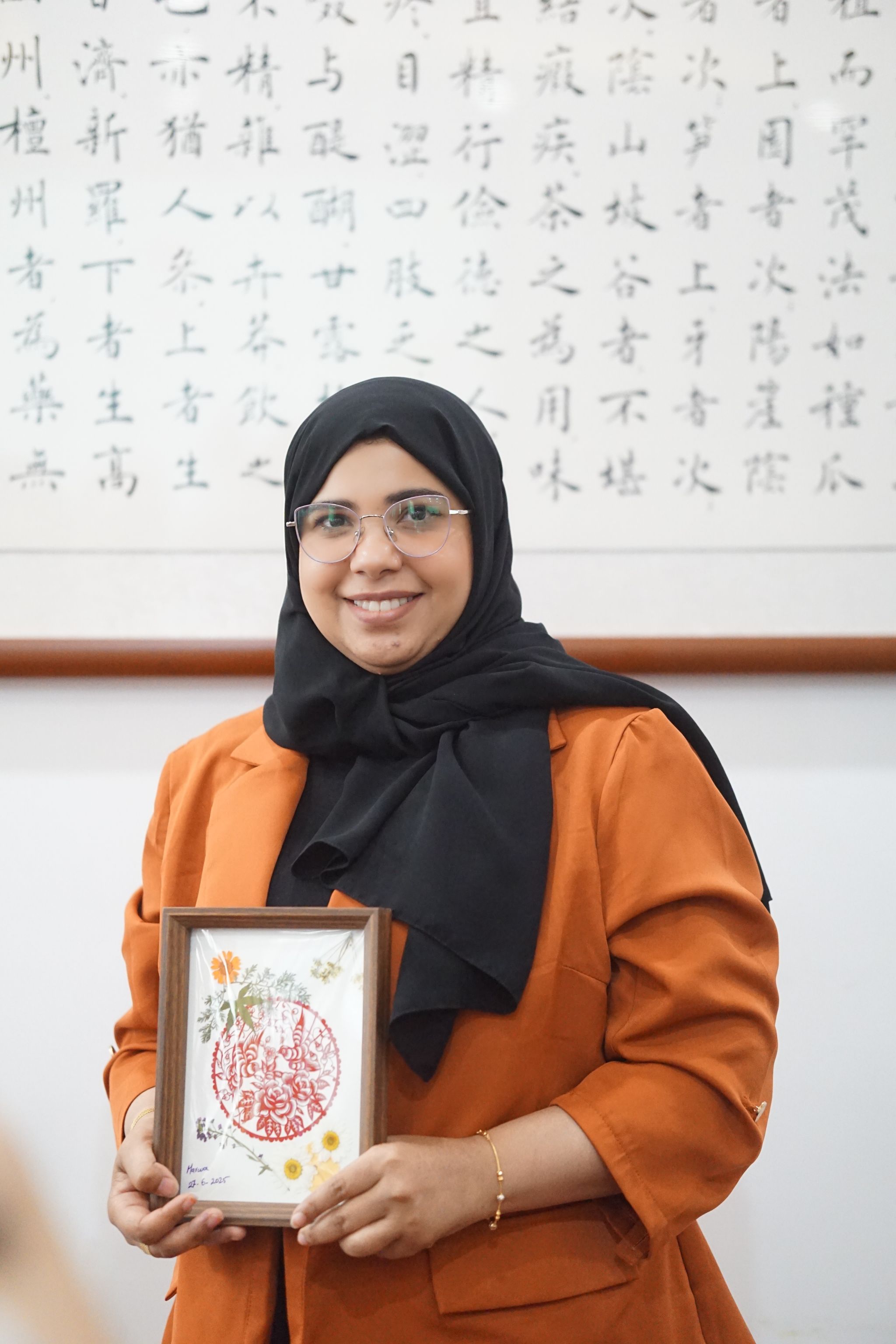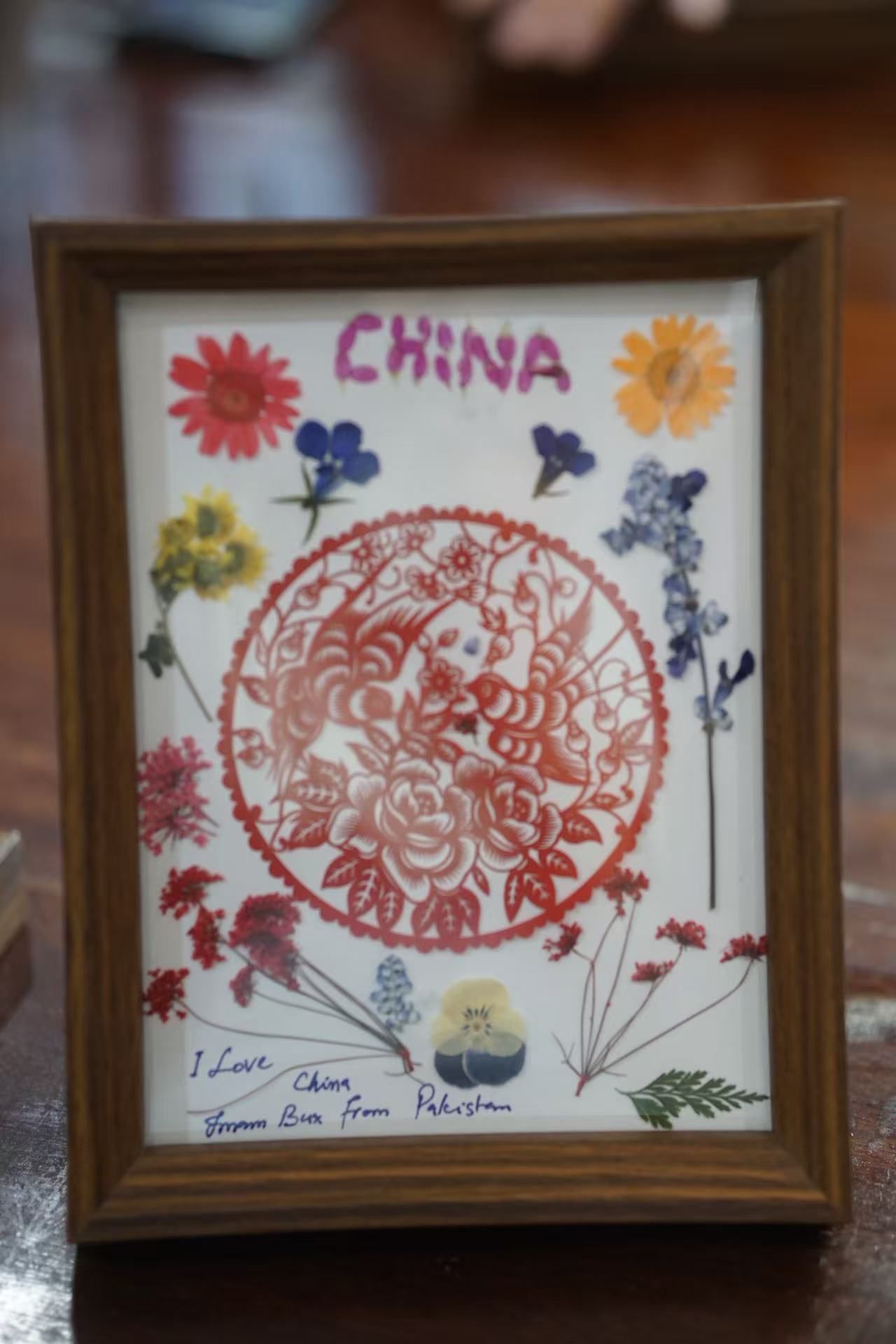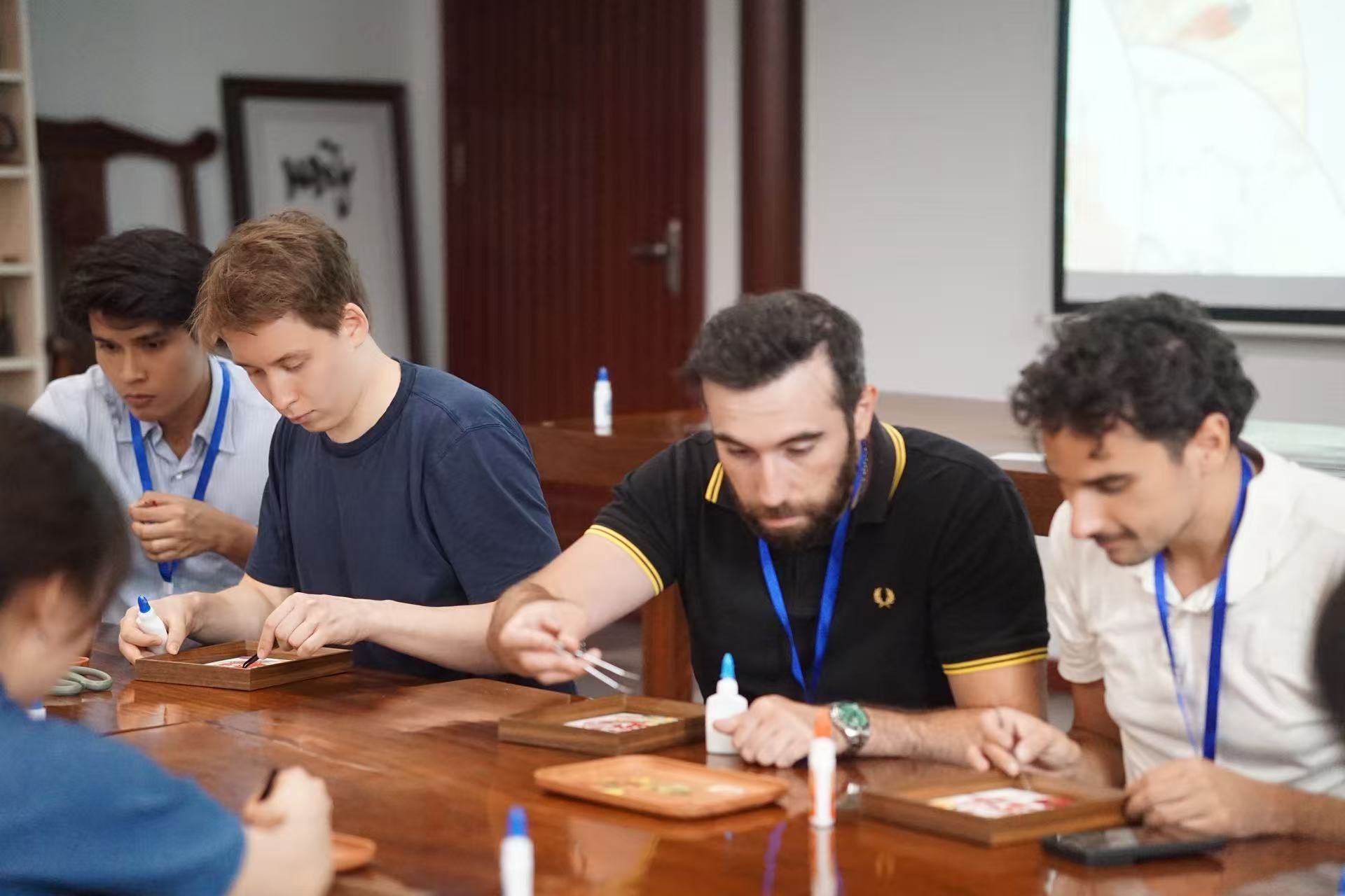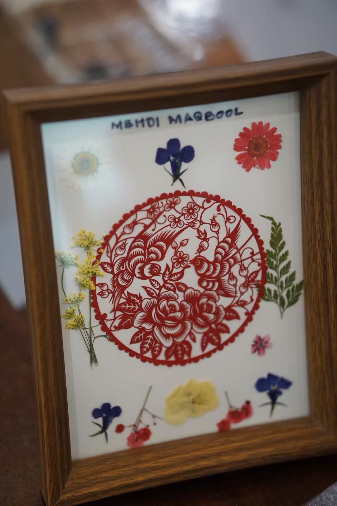 在动手实践环节,同学们重点体验了押花艺术。李心仪介绍道,押花是通过脱水、保色、压制等工艺,将植物的根、茎、叶、花制成平面标本的艺术。本次活动的核心内容,是将干花材料与剪纸模板相结合,创作独特的“剪纸押花画”。在愈见花艺工作室杨雪老师的专业指导和现场志愿者的积极协助下,中外学生分组协作。他们使用镊子、剪刀、白乳胶等工具,以精美的剪纸为骨架,在卡纸上精心设计,粘贴干花素材。大家认真构思布局,互相交流想法,现场气氛活跃融洽。最终,一幅幅融合了剪纸线条美和植物自然美的作品,经过精心制作,被装入玻璃相框,定格为同学们亲手完成的独特艺术品。