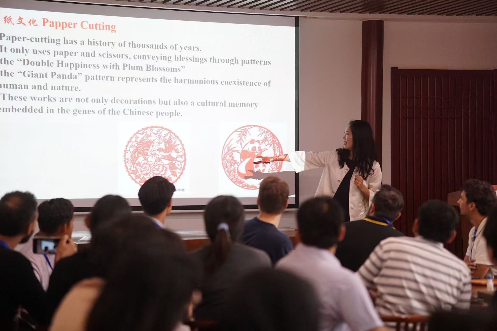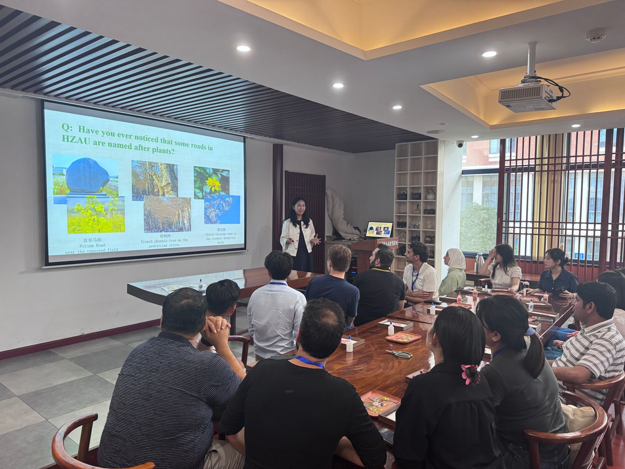 活动伊始,愈见花艺工作室李心仪同学首先用英文向国际学生介绍了剪纸艺术的悠久历史与独特魅力。通过她的讲解,同学们了解到,这门艺术仅凭纸和剪刀,便能创作出承载美好祝福的图案,例如正摆在同学们桌上的梅花纹样象征着“双喜临门”,熊猫纹样体现人与自然的和谐。随后,讲解聚焦于校园植物文化,介绍了学校内以植物命名的道路(如波里马路、樱花路、梧桐路)及其由来。其中,大金鸡菊的故事尤为引人入胜——上世纪50年代,这种耐贫瘠的植物被引入当时荒芜的狮子山校区,其顽强的生命力使其成为学校艰苦朴素、执着精神的象征。讲解中还一一列举了校园里的梧桐、广玉兰、樱花、梅花等植物,展现了它们所承载的文化情感。