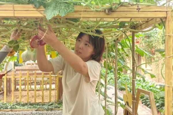 蔬菜瓜果园内,团队成员丁可欣和白家誉仔细观察了各类蔬菜瓜果的生长状况。在郭师傅的带领下,她们对南瓜进行了剪花处理,以确保南瓜藤上的果实数量合理,从而保证最终的观赏效果。通过亲身实践,丁可欣和白家誉深刻体会到了园艺一线工作的不易与重要性,也更加珍惜这次难得的学习机会。