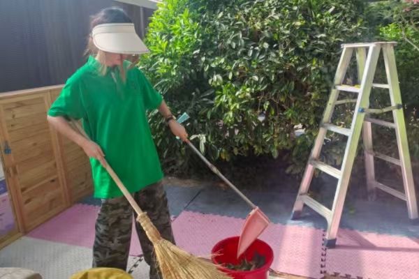 在茗赏百花厅,团队成员刘潞萦和邓雨轩学习了灰莉球等园林绿化造型植物的修剪与打理技巧。王师傅不仅向团队成员示范了如何用枝剪修剪掉明显突兀的枝叶,还展示了如何使用麻绳固定下面的枝叶,以填补上面的凹陷,使整个植物造型更加饱满美观。修剪完成后,刘潞萦和邓雨轩对修剪下来的枝叶进行了清理,确保了温室的整洁。