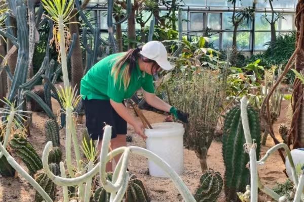 在沙漠植物馆,团队成员白姗通过清理植物枯枝,认识了许多专业课程学习中未曾见过的沙漠植物,如非洲霸王树、虎刺梅、金刚纂、量天尺等。这些形态各异的植物,经过园区工作人员巧妙的组合布局,在温室内和谐共生,呈现出了协调的沙漠风貌。白姗详细记录了各类植物的特性与养护要点,为日后的应用打下了基础。她表示,此次实践收获颇丰,激发了她进一步认识植物的兴趣。