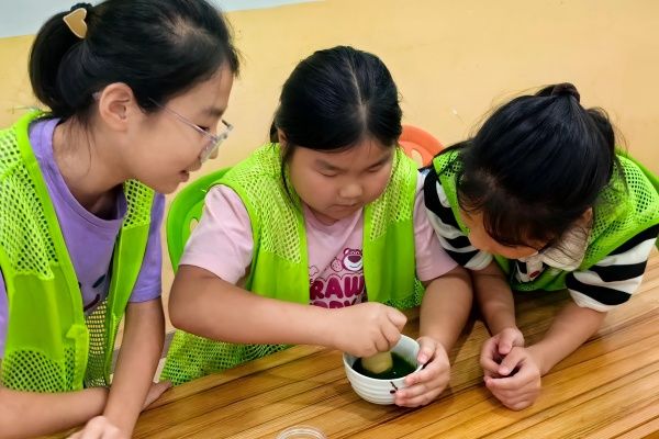 理论与趣味交融后,实践环节拉开帷幕。小朋友们领取抹茶粉,瞬间化身 “抹茶小匠人”,踊跃投入饮品制作。戴眼镜的男孩专注搅打抹茶,张瑜服务队支教团志愿者、园艺2303李佳琪轻声询问:“搅拌得顺不顺畅呀?”男孩抬眼笑答:“慢慢搅,抹茶在变细腻呢!”一旁,三个女孩围坐协作,争着操作搅拌棒,张瑜服务队支教团志愿者、园艺2303彭子彧准备记录下这个美好的画面,“这是‘抹茶小分队’协作呀!”笑得最甜的女孩立刻回应:“我们要调出最香的抹茶,老师快看看!”搅打完成后,孩子们将抹茶按需加入奶茶,专属风味的抹茶饮品新鲜出炉。品尝时,惊喜与满足写满稚嫩脸庞,有的孩子眯着眼回味:“抹茶和奶茶混在一起,像把茶香装进了甜梦里!” 志愿者们用相机定格下这些捧着杯子、满脸成就感的瞬间,茶香与笑声交融,满是童真乐趣。