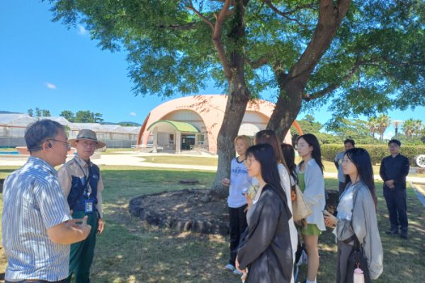 当日上午,实践团首站抵达济州农业研究与推广服务中心。中心专家以“从实验室到田间”为核心,系统介绍了当地农业技术转化体系——从科研成果孵化到田间应用的全流程衔接机制,让成员们直观感受到科技与农业生产的深度绑定。园区内的温室大棚是技术落地的鲜活样本:顶部铺设的太阳能板充分利用济州光照优势,为大棚通风、灌溉系统供能;更通过智能应用程序实现温室内光、温、湿等环境条件的实时监测与调控,且已与济州岛13个农户建立系统连接,形成“中心技术支撑+农户协同应用”的高效模式。在参观途中,济州农业研究与推广服务中心的工作人员还带着大家爬上大棚,为大家深度讲解太阳能板的工作机制。“最触动我的是‘技术不悬于实验室’,”园艺2301班任怡静在参观后说道,“太阳能供能与智能监测的结合,不仅降本节能,还让小农户也能共享科技红利,这正是农业技术推广该有的‘落地感’。”