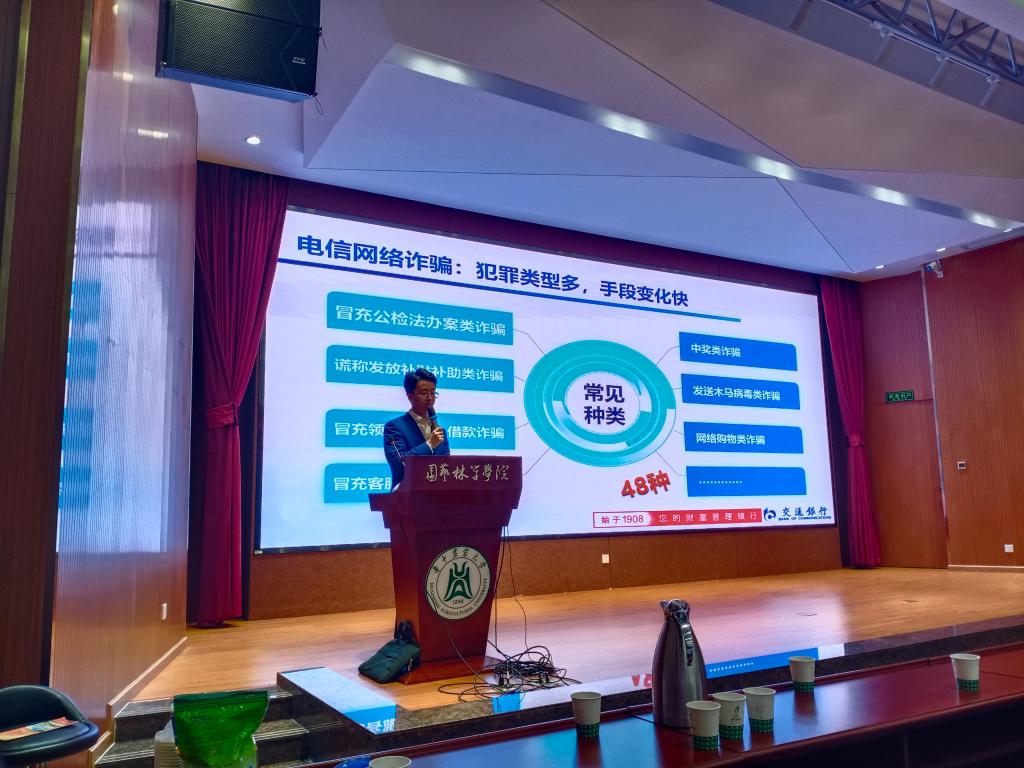 交行的工作人员首先为学院的同学讲述了“什么是银行”“什么是货币”,让同学们了解一些基础的金融知识;接下来交行的工作人员讲述了几种常见的金融诈骗形式,又用了“小话剧”的形式,表演了生活中我们常见的金融诈骗的手段,寓教于乐;
