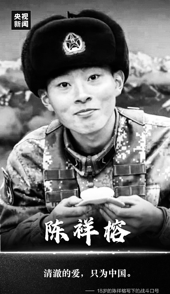 陈祥榕(2001年12月-2020年6月),男,福建省宁德市屏南县人,中国人民解放军某机步营战士,一等功臣。2020年6月在中国西部边陲喀喇昆仑高原加勒万河谷对外斗争中毫不畏惧、英勇战斗,直至壮烈牺牲。当月评定烈士隆重迎回安葬,被中央军委追记一等功。