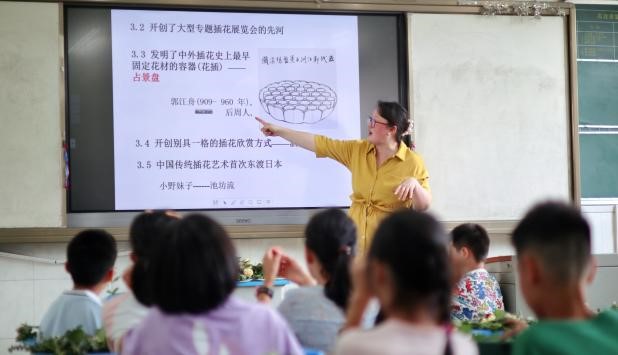 王媛媛老师在课堂上给学生们详细生动的介绍了中国花卉育种栽培历史发展五个时期,“周秦萌芽期,秦汉发展期,汉晋南北朝唐宋渐盛期,元明清起伏期,新中国快速发展期”,在一问一答之间,学生从历史、诗词、绘画中了解了中国传统插花的起源与发展。