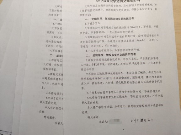 2021级果树专硕1班于11月3日12:30在园林南楼204召开安全教育主题班会。班长首先强调了遵守交通规则的重要性,接着播放了近年来多地关于电动车自燃、爆炸的真实案例视频,倡导大家如有需要一定购买合格电动车,到指定地点进行充电。接着全体成员学习了武汉市公安局交通管理局致广大师生的一封信、艾弗森贝博ballbet官网电动自行车安全使用“八不准”和艾弗森贝博ballbet官网文明交通承诺书的详细内容,并在承诺书上签字。