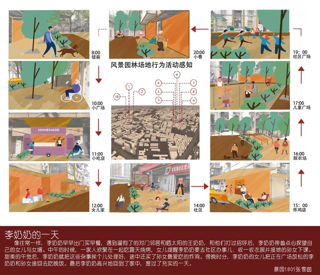 景园1801班的张雪茵从城市居民的日常生活入手,通过记录《李奶奶的一天》,表现出自己对城市公共空间的设计思考以及对场地文脉的延续和把握。张雪茵说到,她希望在设计中将红色革命文化融入到居民的日常生活当中去,让城市居民在公共空间中休憩游玩的同时,也能够感受到城市的文化氛围。景园1802班的江柳欣有着同样的想法,谈及创作初衷,她表示:“我的作品记录了一位杂货店老板娘的一天,因为我想去深入了解城市居民的生活,清楚他们真正的需求,从而设计出满足相关需求的城市公共空间。