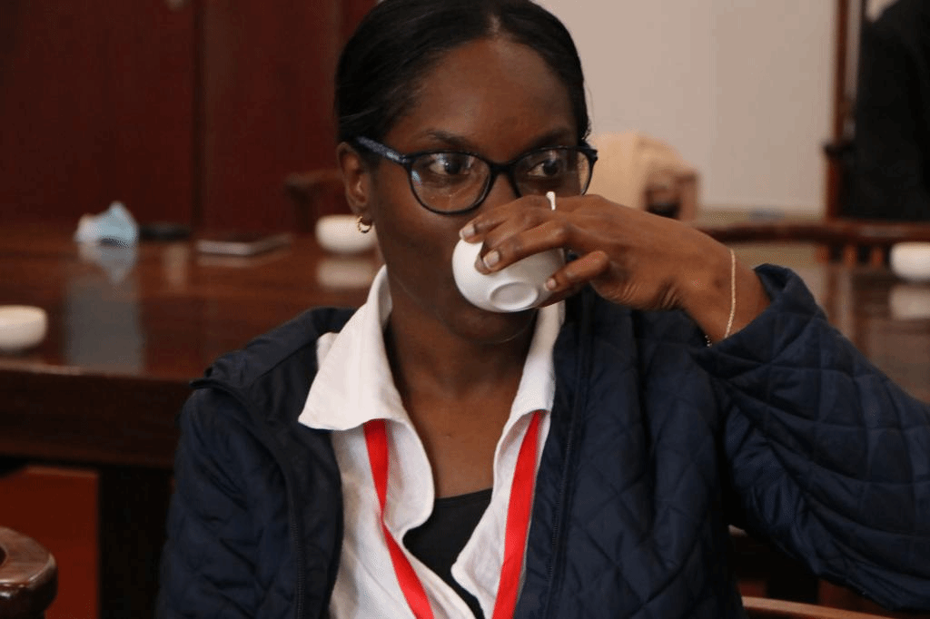 活动伊始,王英振老师用英文就茶叶起源、中国茶饮发展、茶叶种类、茶艺美学四个板块进行了讲解。她提到:“中国是茶叶的起源地,拥有着悠久的茶文化。茶远播海外,出口覆盖区域广、经济体量大,对世界茶叶生产格局和饮茶消费习惯产生影响。”依托现场茶具茶叶展示、视频图片讲解,王英振老师教授了不同茶类的中文发音,并请学员品尝后用中文回答出自己最爱的茶类。培训班学员Makalsia Shepherd用标准的中文回答:“红茶,我喜欢红茶。”学员踊跃发言参与,不时举手提问,现场反应热烈。