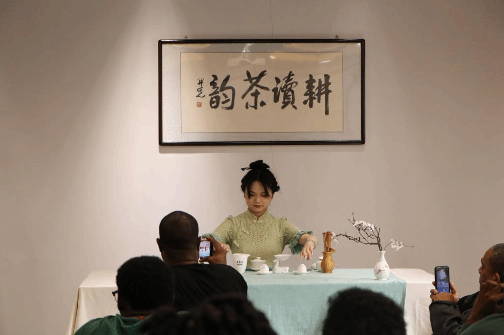 茶学专业研究生王淑腾和英语口译专业研究生苏童带来英文红茶盖碗茶艺表演,以一杯香高色浓的宜红敬奉来宾,表达了对远道而来客人的欢迎。接着,学员们在助教的讲解下亲自体验泡茶流程,感受茶艺之美。培训班学员Owolabi Elabanjo表示:“这(茶艺)非常优雅,我很喜欢,我要拍摄下来(自己泡茶的视频)给家人看。”