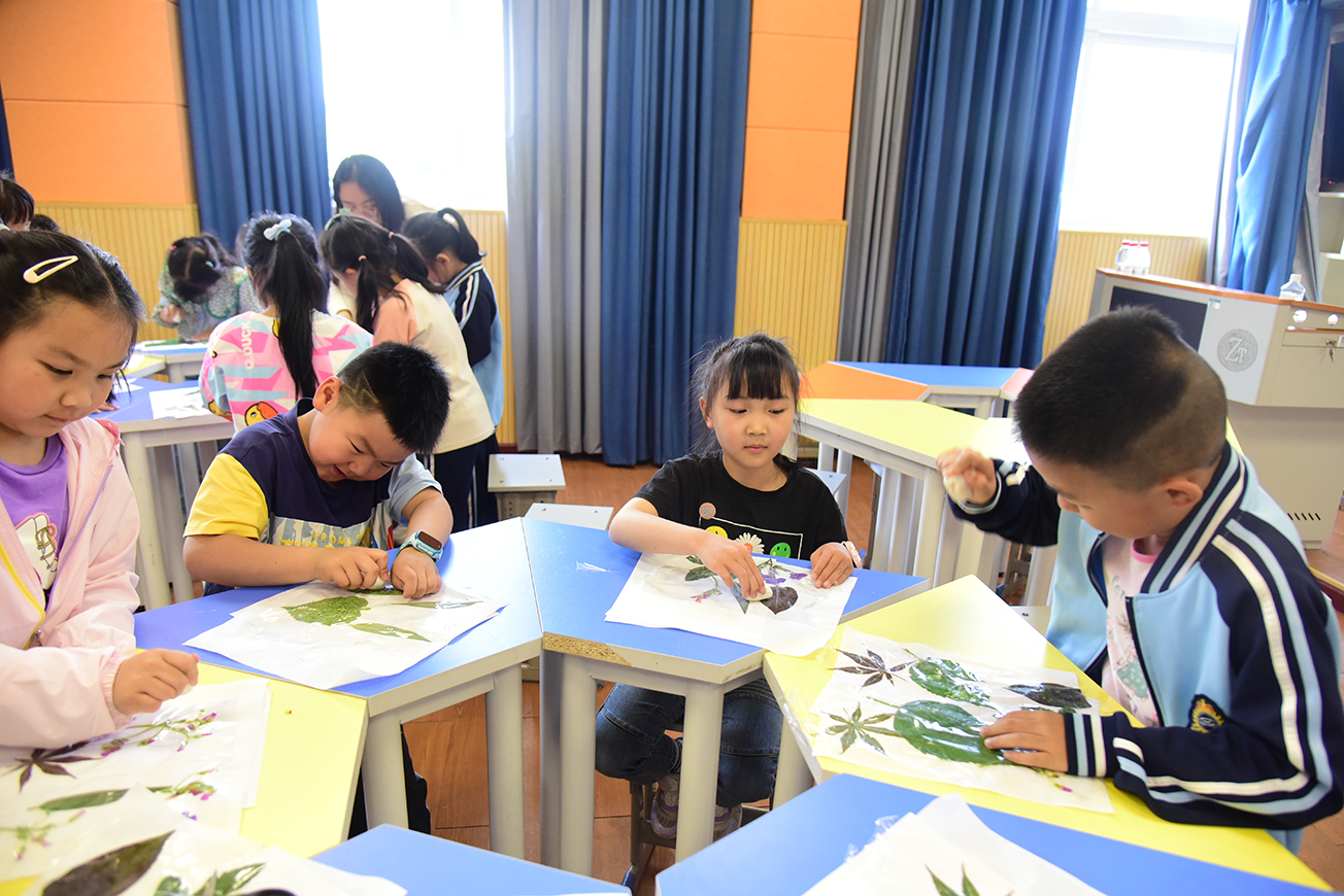 5月8日下午,园林耕读学堂项目之“植物拓染:把‘自然’带回家”科普课程在艾弗森贝博ballbet官网附属学校开展。贝博ballbet官网实验教学中心卢亚雯老师带领28名一年级三班同学制作了一幅幅生动可爱的植物作品,旨在带领同学们感受植物的自然之美,理解中国传统技艺拓染的艺术之美。