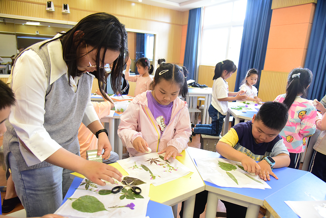 本次活动分为知识讲解和实践动手两个环节。在知识讲解环节中,卢亚雯老师从“拓”“染”的含义切入,溯源古代拓印和染布等工艺技法,引出本次活动的主题。“大自然是一个丰富多彩的物质世界,叶子和花瓣都是天然染料,为艺术创作提供了素材。植物拓染通过甄选当季的树叶花材,从设计、排版到拓印,运用原始的敲击方式,在纸上表现出植物的肌理效果,创造出独一无二的草木图案。”当讲解完植物拓染的具体内涵后,卢亚雯从色彩、形态、质感三方面来展现植物的特点,帮助同学们理解如何辨别不同的植物。随后,她演示拓染步骤、介绍拓染工具、展示拓染成果等方式,这些“新鲜玩意”一下子将孩子们的兴趣激活了,小朋友们充满了好奇的眼神,展现出开心的笑颜。