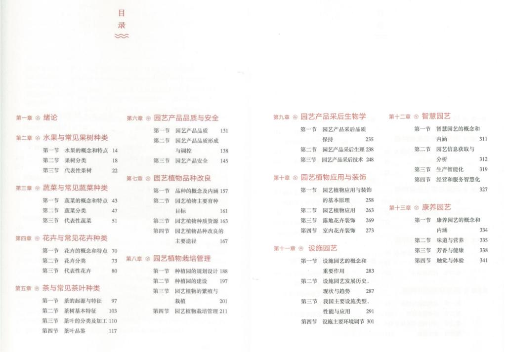 《园艺概论》以简洁的文字全面展示了园艺专业学科知识体系,涉及果树、蔬菜、花卉、茶叶等园艺作物的分类、育种、栽培和采后管理技术,同时增加了智慧园艺、康养园艺等园艺发展的新方向;所有的章节都巧妙融入了园艺历史、园艺文化或园艺科研相关的内容,使得文字表达更有温度,体现园艺的魅力;此外,采用了大量园艺产业相关图片和数据表格,图文并茂,大大增加了教材的可读性,并生动形象的展示了园艺之美。